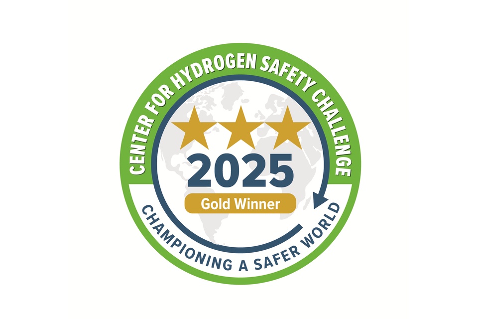 Photo: 2025 Gold Winner badge for the Center for Hydrogen Safety Challenge, featuring three gold stars and the phrase ‘Championing A Safer World.’