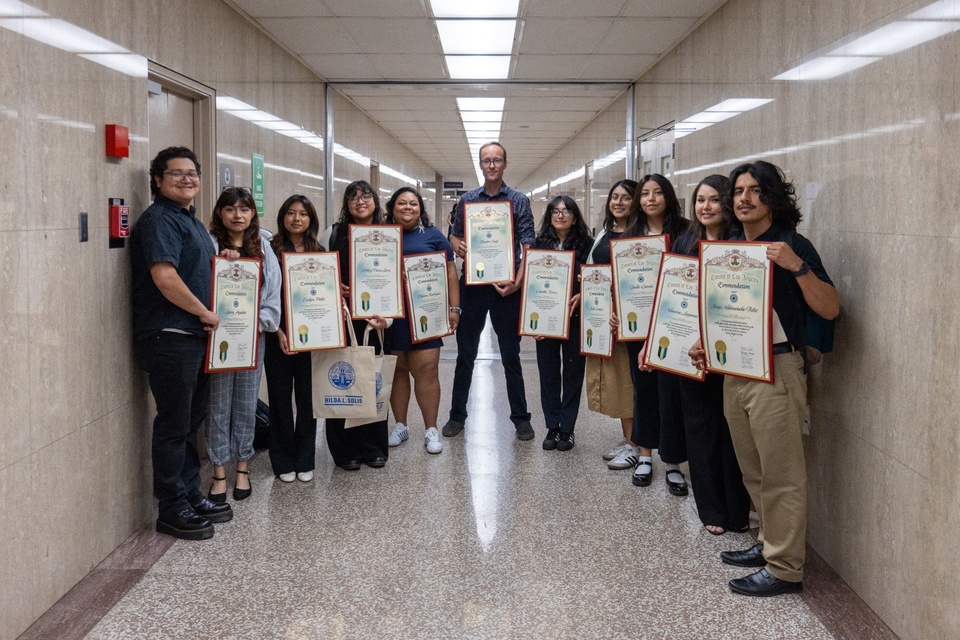 Supervisor Hilda Solis, whose district includes unincorporated East Los Angeles, presented the scrolls to nine current and graduated Cal State LA students during the board’s regular meeting at the Kenneth Hahn Hall of Administration on Tuesday, July 22. The students’ groundbreaking work with the university’s Los Angeles Economic Equity Accelerator and Fellowship (LEEAF) program has led to changes that have benefited small businesses serving the neighborhoods around the university.