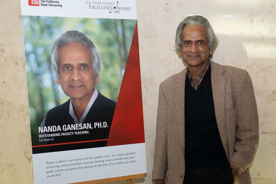 Nanda Ganesan (Information Systems) was presented the California State University’s (CSU) Wang Family Excellence Award for Outstanding Faculty Teaching on Jan. 28, 2025. Ganesan is one of only four faculty and one staff member in the 23 CSU campuses to be selected this year. The award honors faculty and staff for unwavering commitment to student achievement and advancing the system’s mission through excellence in teaching, scholarship, and service. As part of the recognition, Ganesan received a $20,000 award that was provided through a gift from CSU Trustee Emeritus Stanley T. Wang and administered through the CSU Foundation.